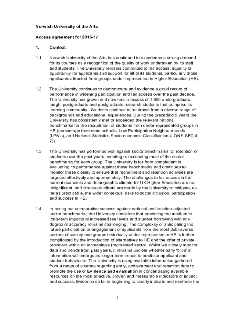 Norwich University of the Arts Access agreement for 201617 1. Context1.1Norwich University of the Arts has continued to experience a strong demand for its courses as a recognition of the quality of