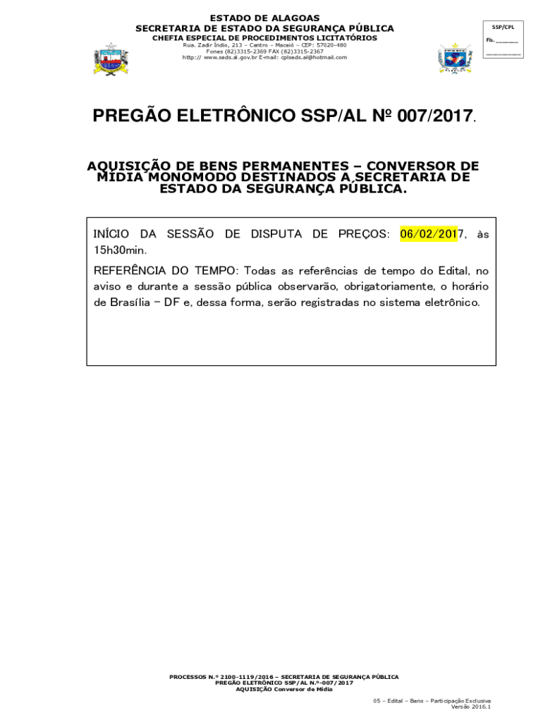 SECRETARIAT DE ESTATE DA SEGURA PICASSO/CPLCHEFIA ESPECIAL DE PROCEDIMENTOS LICITATRIOSFls. ___RUA. Nadir Indio, 213 CENTR Maya CEP: 57020480