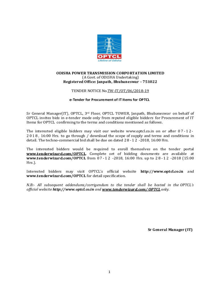 ODISHA POWER TRANSMISSION CORPORATION LIMITED (A Govt. of ODISHA Undertaking) Registered Office: Jan path, Bhubaneswar 751022 TENDER NOTICE No.TWIT/OT/06/201819 tender for Procurement of IT Items