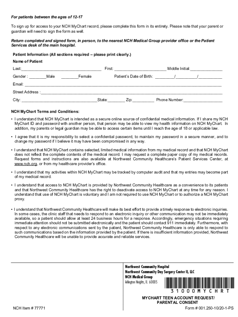 For patients between the ages of 1217 To sign up for access to your INCH Chart record, please complete this form in its entirety. Please note that your parent or guardian will need to sign the form