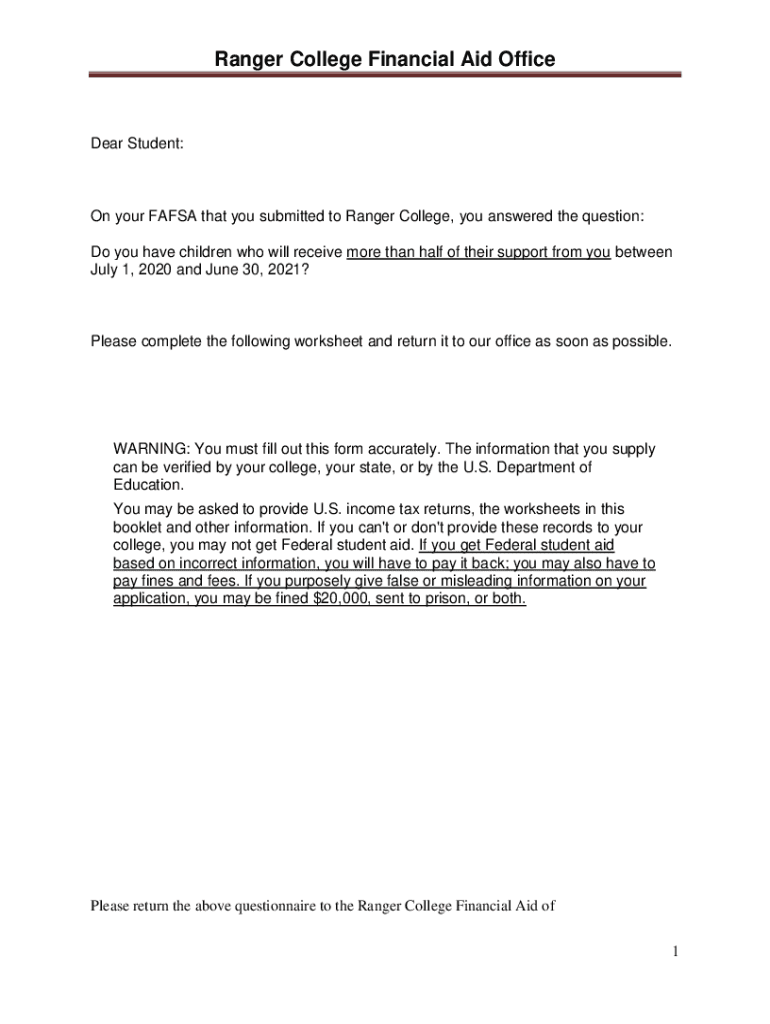 Ranger College Financial Aid Officer Student:On your FAFSA that you submitted to Ranger College, you answered the question: Do you have children who will receive more than half of their support from