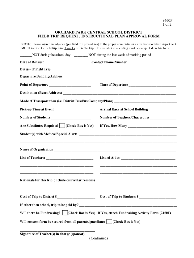 8460F 1 of 2 ORCHARD PARK CENTRAL SCHOOL DISTRICT FIELD TRIP REQUEST / INSTRUCTIONAL PLAN APPROVAL FORM NOTE: Please submit in advance (per field trip procedures) to the proper administrator as the