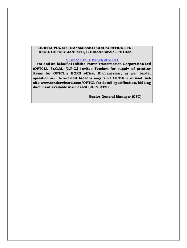 ODISHA POWER TRANSMISSION CORPORATION LTD. RED. OFFICE: WARPATH, BHUBANESWAR 751022, tender No. CPC29/202021 For and on behalf of Odisha Power Transmission Corporation Ltd (OP TCL), Sr. G.M. [C.P.C.]