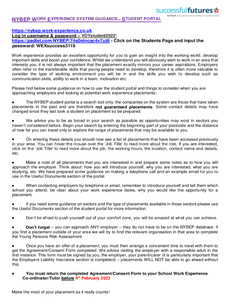 NY BEP WORK EXPERIENCE SYSTEM GUIDANCE STUDENT PORTAL https://nybep.workexperience.co.uk Log in username & password VOYstudent2023* https://padlet.com/NYBEP/74s0nlncsc4v7ut8 Click on the Students