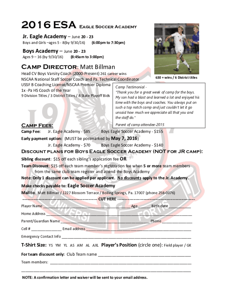2016 ESA Eagle Soccer Academy Jr. Eagle Academy June 20 23 Boys and Girls ages 5 8(by 9/30/16)(6:00pm to 7:30pm)Boys Academy June 20 23 Ages 9 16 (by 9/30/16)(8:45am to 3:00pm)Camp Director: Matt