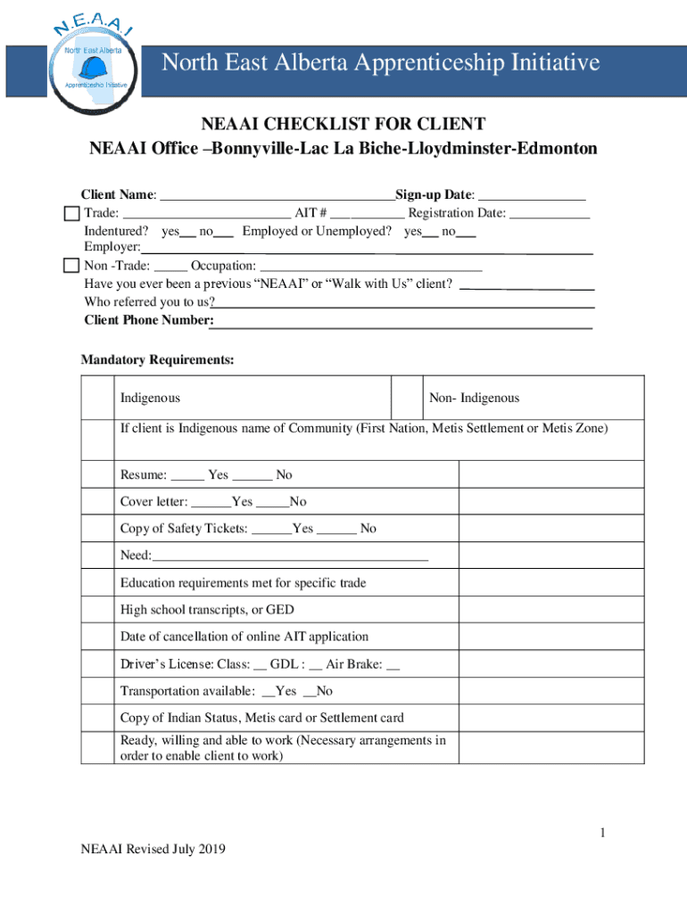 North East Alberta Apprenticeship Initiative NE AAI CHECKLIST FOR CLIENT NE AAI Office BonnyvilleLac La BicheLloydminsterEdmonton Client Name: ___Sign up Date: ___ Trade: ___ AIT # ___ Registration
