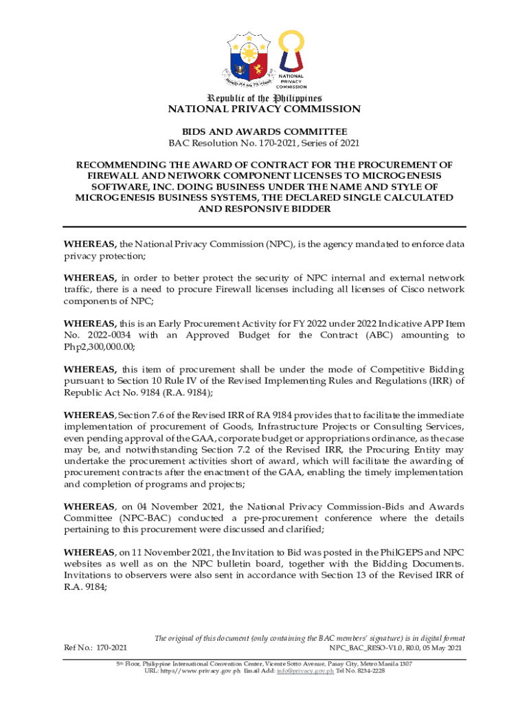 Republic of the Philippines NATIONAL PRIVACY COMMISSION BIDS AND AWARDS COMMITTEE BAC Resolution No. 1702021, Series of 2021 RECOMMENDING THE AWARD OF CONTRACT FOR THE PROCUREMENT OF FIREWALL AND