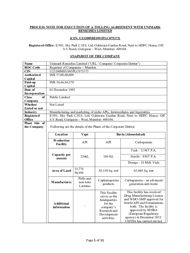 PROCESS NOTE FOR EXECUTION OF A TOLLING AGREEMENT WITH UNITARY REMEDIES LIMITED [IN: U23200MH1993PLC075373] Registered Office: E/501, Sky Park C.H.S. Ltd, Oshawa Garden Road, Next to HDFC House, Off.