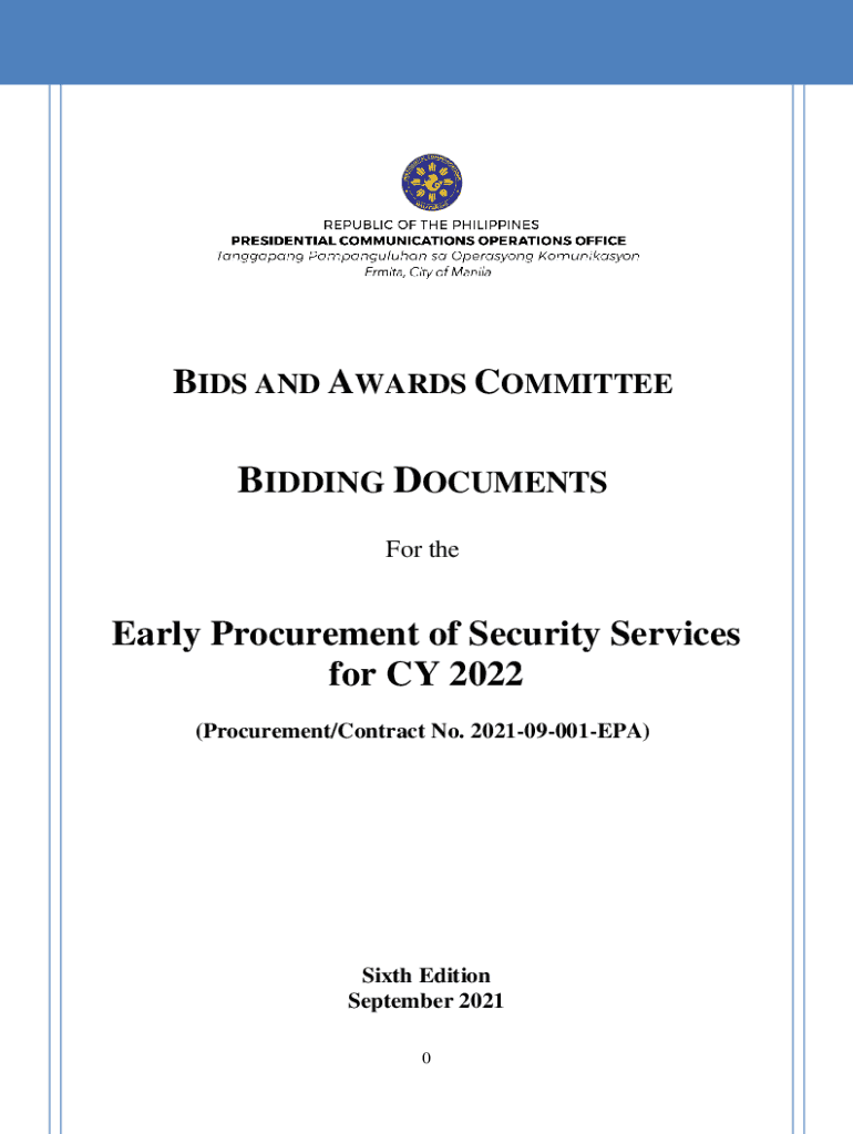 BIDS AND AWARDS COMMITTEEBIDDING DOCUMENTS For early Procurement of Security Services for CY 2022 (Procurement/Contract No. 202109001EPA)Sixth Edition September 2021 0Table of Contents Glossary of