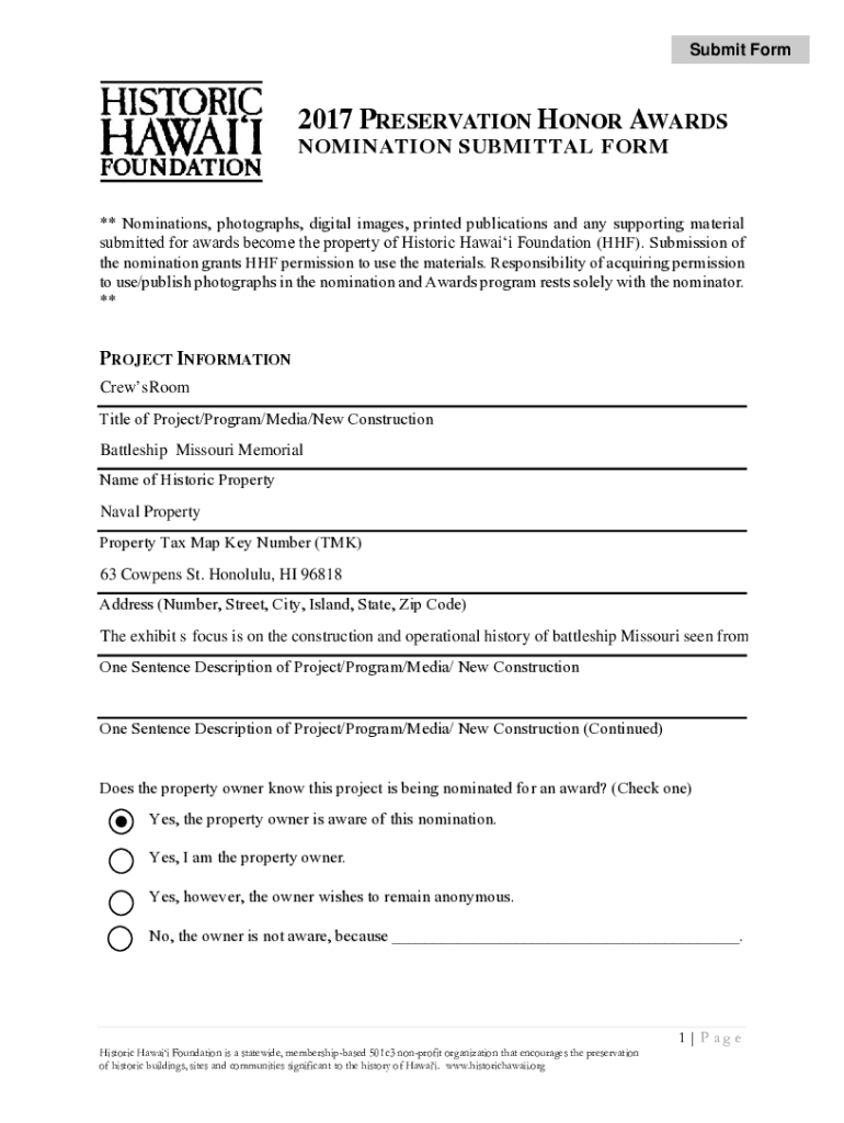 Submit Form2017 PRESERVATION HONOR AWARDS NOMINATION SUBMITTAL FORM** Nominations, photographs, digital images, printed publications and any supporting material submitted for awards become the property