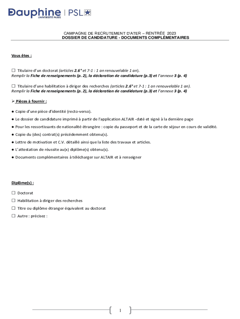 DOSSIER DE CANDIDATURE DOCUMENTS COMPLMENTAIRESVous TES : Titular dun doctoral (articles 2.6 ET 71 : 1 a recoverable 1 an).
