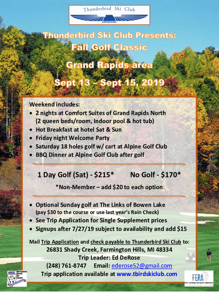 Weekend includes: 2 nights at Comfort Suites of Grand Rapids North (2 queen beds/room, Indoor pool & hot tub) Hot Breakfast at hotel Sat & Sun Friday night Welcome Party Saturday 18 holes golf w/