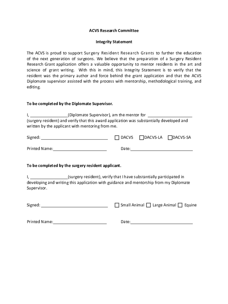 Get the free ACVS Research Committee Integrity Statement