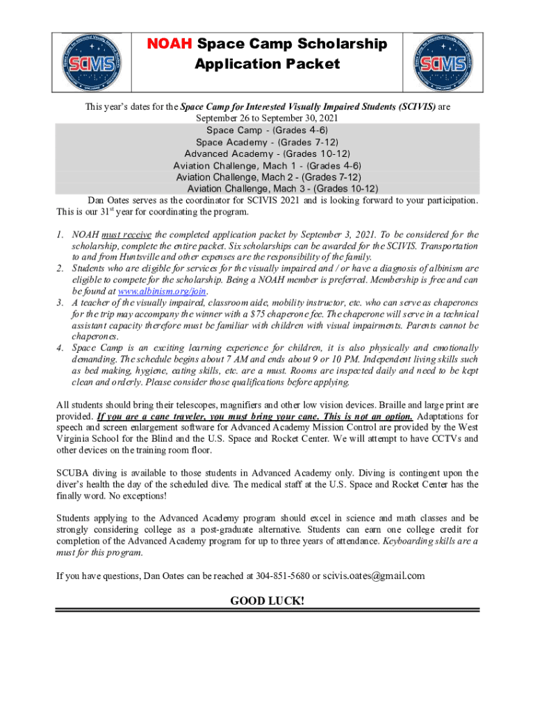 NOAH Space Camp Scholarship Application Packet This year's dates for the Space Camp for Interested Visually Impaired Students (CIVIL) are September 26 to September 30, 2021, Space Camp (Grades 46)
