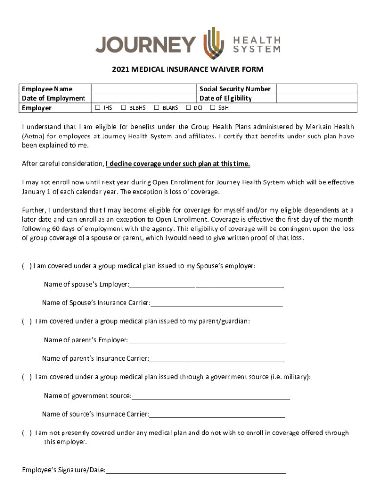 2021 MEDICAL INSURANCE WAIVER FORM Employee Name Date of Employment EmployerSocial Security Number Date of Eligibility JHS BLAHS BARS DCI SBI understand that I am eligible for benefits under the Group
