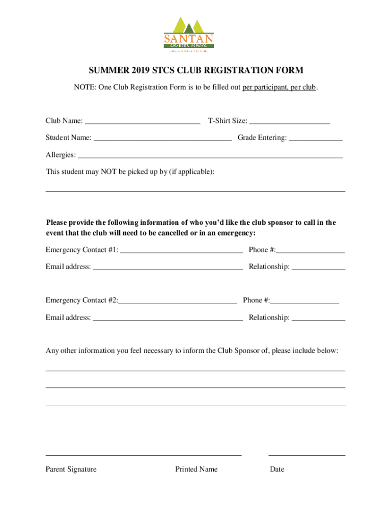 SUMMER 2019 SACS CLUB REGISTRATION FORM NOTE: One Club Registration Form is to be filled out per participant, per club. Club Name: ___Shirt Size: ___Student Name: ___ Grade Entering: ___ Allergies: