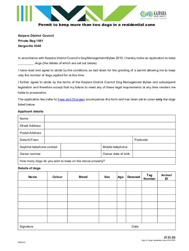 Permit keeping more than two dogs in a residential zone Kampala District Council Private Bag 1001 Danville 0340In accordance with Kampala District Councils Dog Management Bylaw 2019, I hereby make