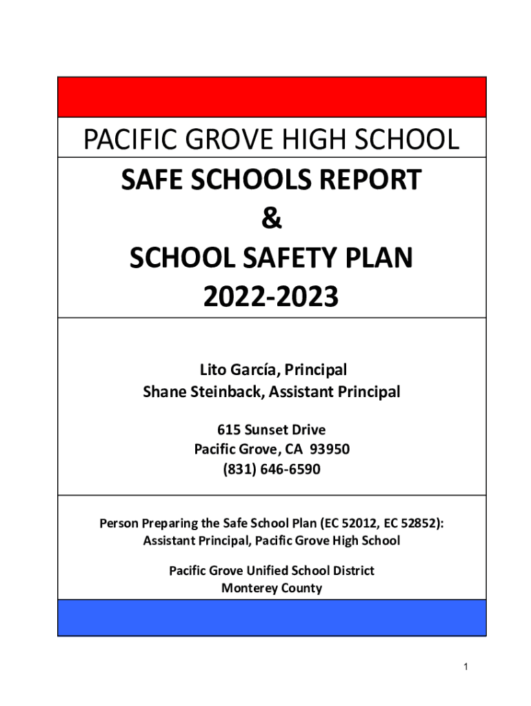 PACIFIC GROVE HIGH SCHOOL SAFE SCHOOLS REPORT & SCHOOL SAFETY PLAN 20222023 Tito Garcia, Principal Shane Steinbeck, Assistant Principal 615 Sunset Drive Pacific Grove, CA 93950 (831) 6466590 Person