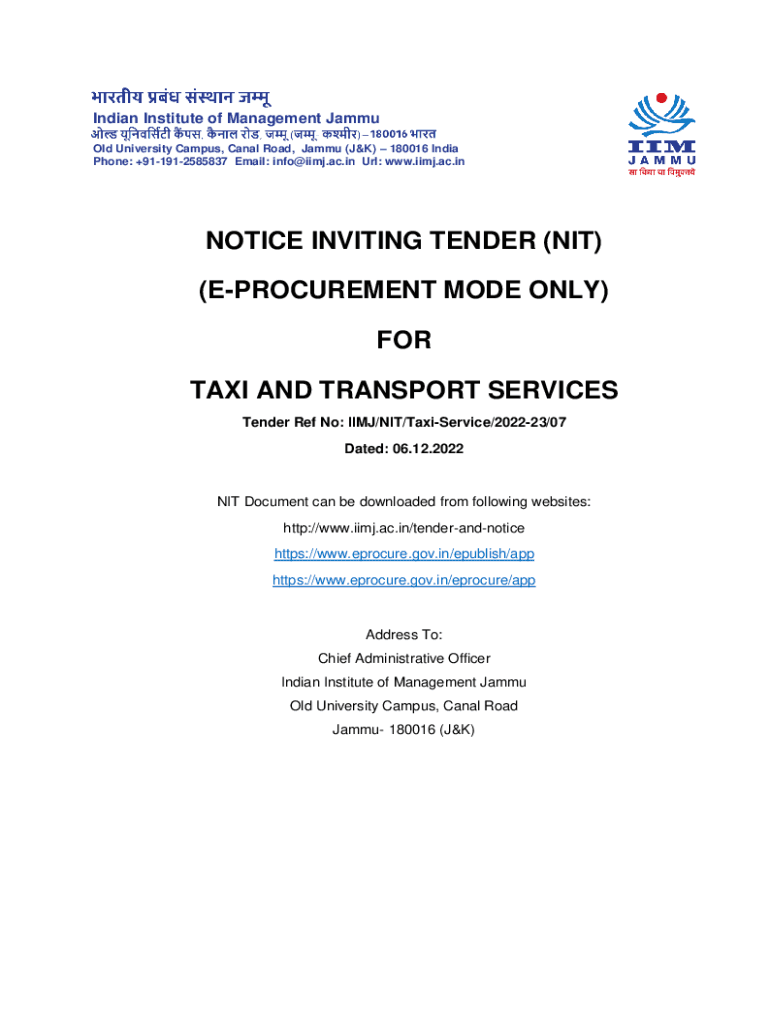 Indian Institute of Management Jammy Old University Campus, Canal Road, Jammy (J&K) 180016 India Phone: +911912585837 Email: info@iimj.ac.in URL: www.iimj.ac.inNOTICE INVITING TENDER (NIT) (PROCUREMENT