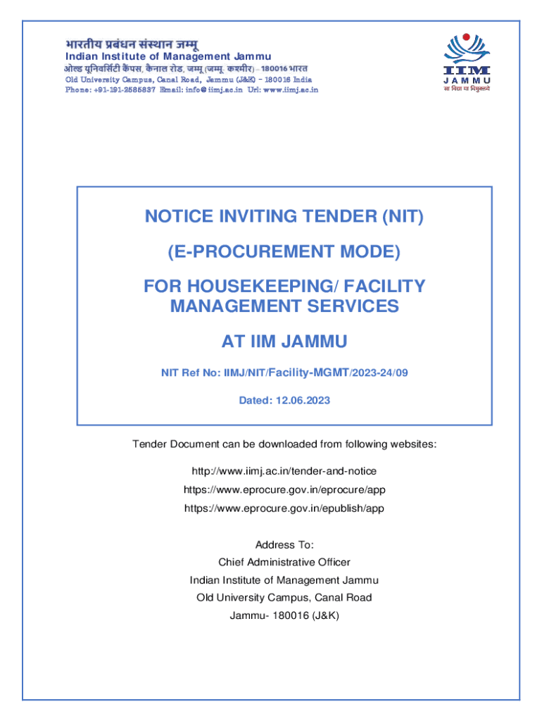 Indian Institute of Management Jammy Old University Campus, Canal Road, Jammy (J&K) 180016 India Phone: +911912585837 Email: info@iimj.ac.in URL: www.iimj.ac.inNOTICE INVITING TENDER (NIT) (PROCUREMENT