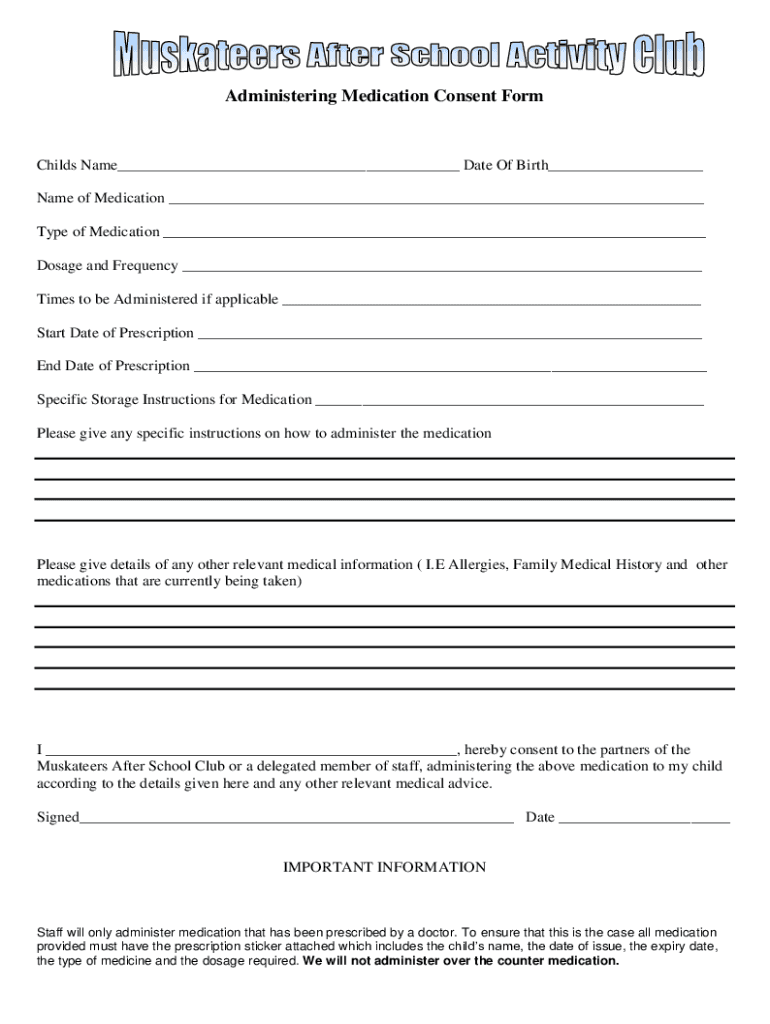 Administering Medication Consent Orchids Name___ Date Of Birth___ Name of Medication ___ Type of Medication ___ Dosage and Frequency ___ Times to be Administered if applicable ___ Start Date of Prescription
