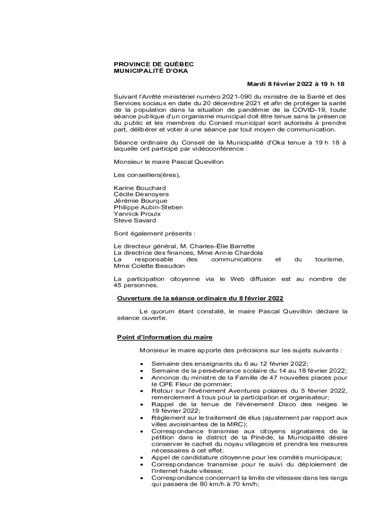 PROVINCE DE QUEBEC MUNICIPALITY DORA Mari 8 frier 2022 19 h 18 Servant Larry ministries humor 2021090 Du minister DE la Sent et DES Services social en date Du 20 December 2021 eta fin DE brother la