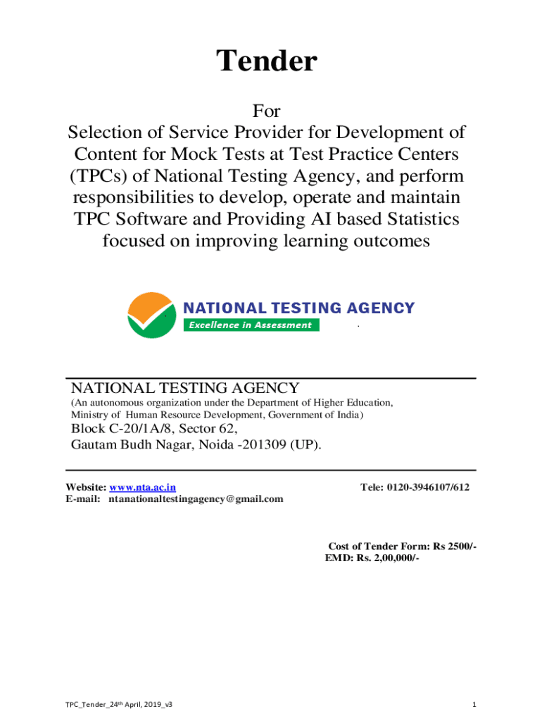 Tender For Selection of Service Provider for Development of Content for Mock Tests at Test Practice Centers (PCs) of National Testing Agency, and perform responsibilities to develop, operate and maintain