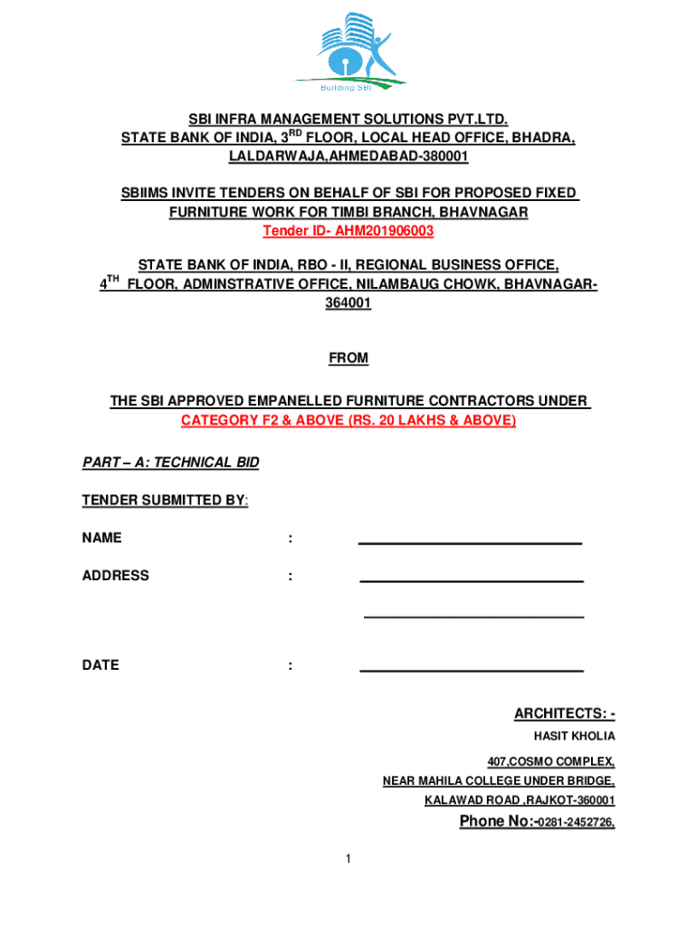 SBI INFRA MANAGEMENT SOLUTIONS PVT.LTD. STATE BANK OF INDIA, 3RD FLOOR, LOCAL HEAD OFFICE, CHANDRA, LALDARWAJA,AHMEDABAD380001 SBI IMS INVITE TENDERS ON BEHALF OF SBI FOR PROPOSED FIXED FURNITURE