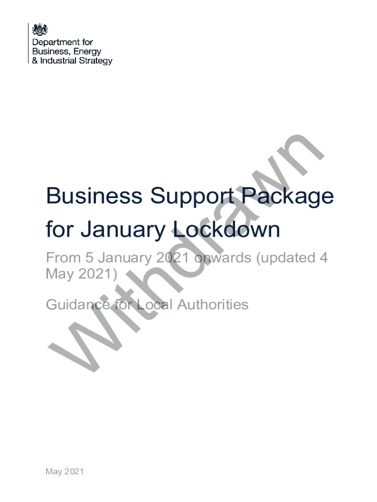 N Dr business Support Package for January LockdownithFrom 5 January 2021 onwards (updated 4 May 2021)Guidance for Local Authorities May 2021n draw with W Crown copyright 2020 This publication is licensed