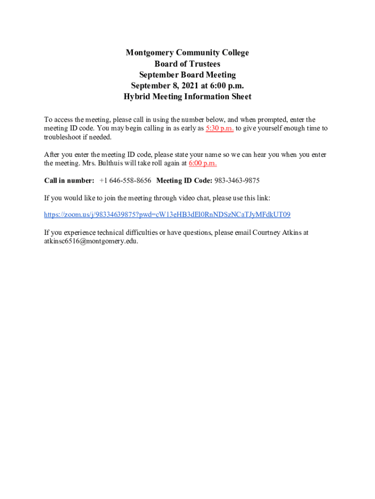 Montgomery Community College Board of Trustees September Board Meeting September 8, 2021, at 6:00 p.m. Hybrid Meeting Information Sheet To access the meeting, please call in using the number below,