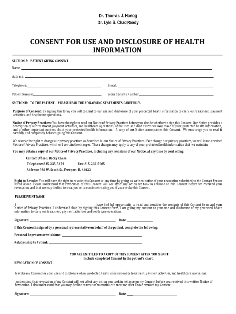 Dr. Thomas J. Harbor Dr. Lyle S. Chad ReedyCONSENT FOR USE AND DISCLOSURE OF HEALTH INFORMATION SECTION A: PATIENT GIVING CONSENT Name: Address: Telephone:Email:Patient Number:Social Security Number:SECTION