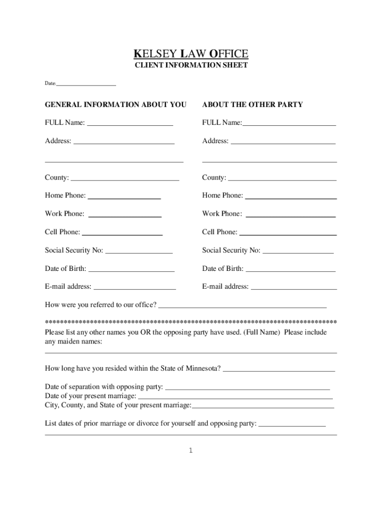 KELSEY LAW OFFICE CLIENT INFORMATION SHEET Date:___ GENERAL INFORMATION ABOUT ABOUT THE OTHER ARTFUL Name: ___FULL Name:___Address: ___Address: _________County: ___County: ___Home Phone:Home Phone:Work
