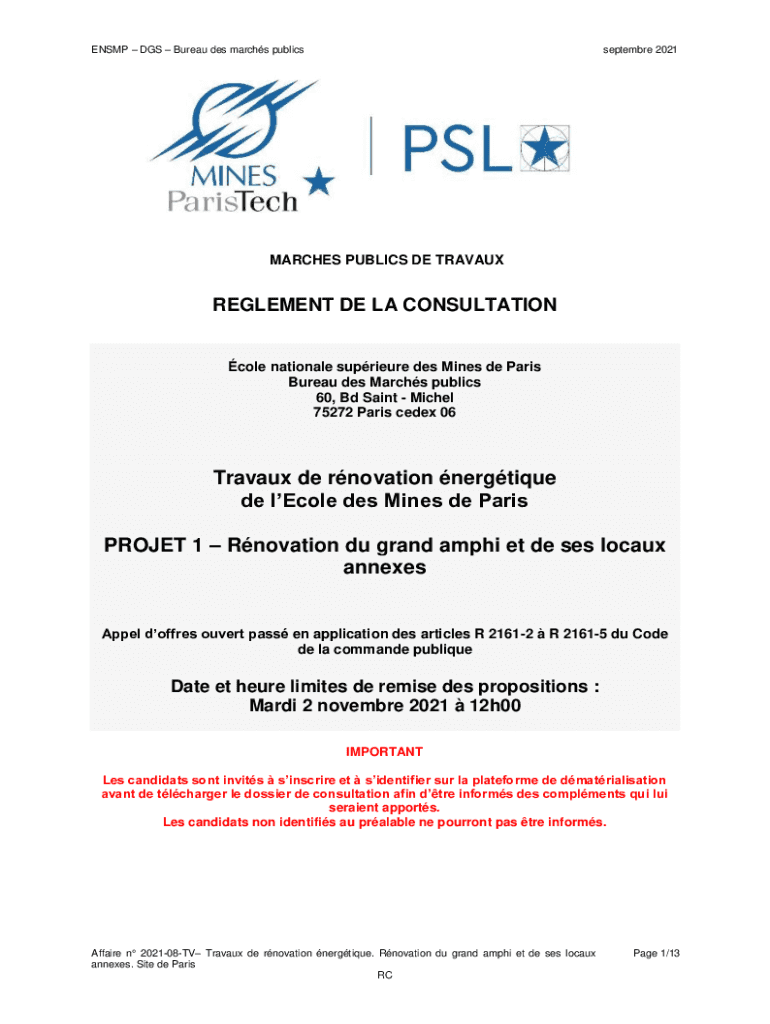 ENSCP DGS Bureau DES marches publicsseptembre 2021MARCHES PUBLIC SDE TRAVAUXREGLEMENT DE LA CONSULTATIONcole national supreme DES Mines de Paris