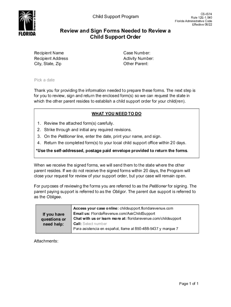 Child Support ProgramReview and Sign Forms Needed to Review a Child Support Order Recipient Name Recipient Address City, State, ZipCSIS74 Rule 12E1.040 Florida Administrative Code Effective 06/22Case