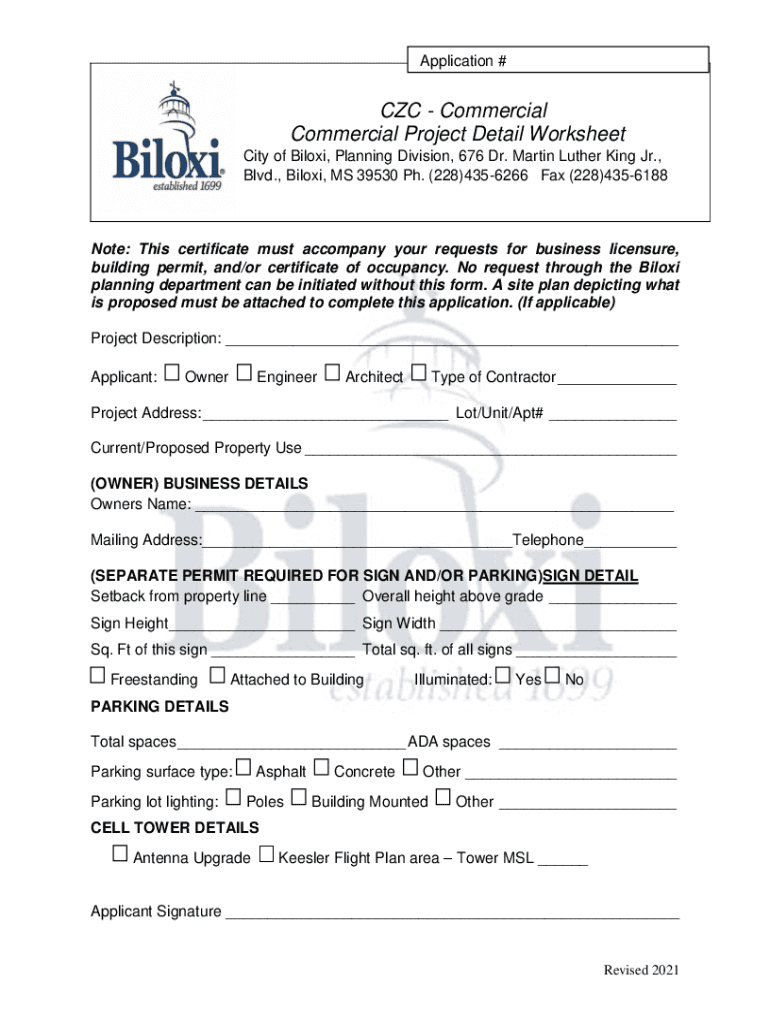 Application #CZC Commercial Project Detail Worksheet City of Biloxi, Planning Division, 676 Dr. Martin Luther King Jr., Blvd., Biloxi, MS 39530 pH. (228)4356266 Fax (228)4356188Note: This certificate