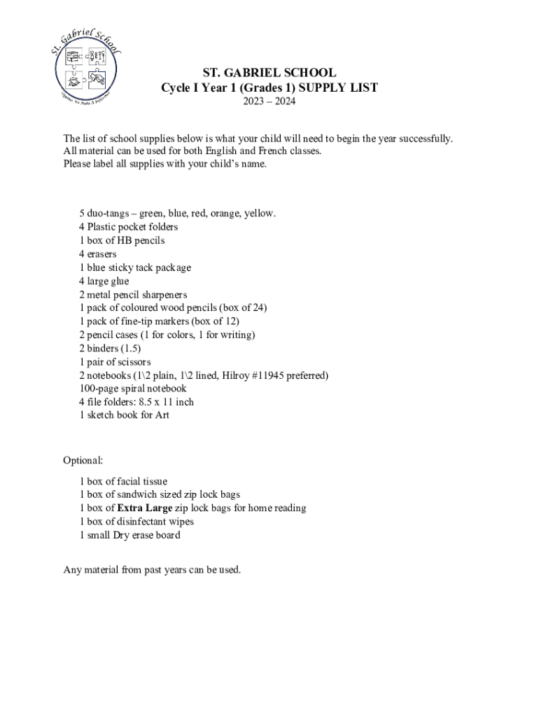 ST. GABRIEL SCHOOL Cycle I Year 1 (Grades 1) SUPPLY LIST 2023 2024The list of school supplies below is what your child will need to begin the year successfully. All material can be used for both English