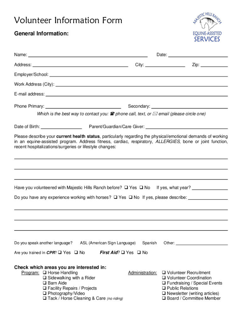 Volunteer Information Form General Information:Name:Date:Address:City:Zip:Employer/School: Work Address (City): Email address: Phone Primary:Secondary:Which is the best way to contact you: phone call,