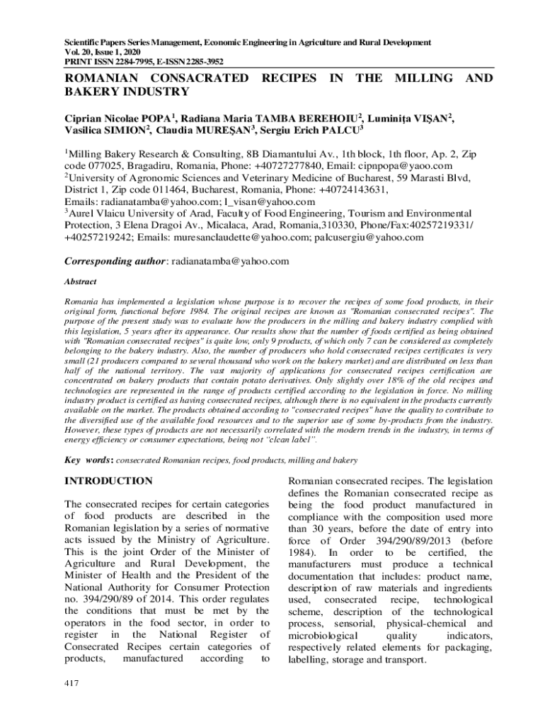 Scientific Papers Series Management, Economic Engineering in Agriculture and Rural Development Vol. 20, Issue 1, 2020 PRINT ISSN 22847995, ISSN 22853952ROMANIAN CONSECRATED RECIPES IN THE MILLING