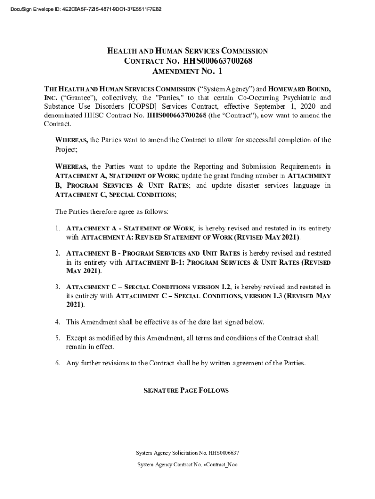 HEALTH AND HUMAN SERVICES COMMISSION CONTRACT NO. HHS000663700268 AMENDMENT NO. 1 THE HEALTH AND HUMAN SERVICES COMMISSION (System Agency) and HOMEWARD BOUND, INC. (Grantee), collectively, the \”