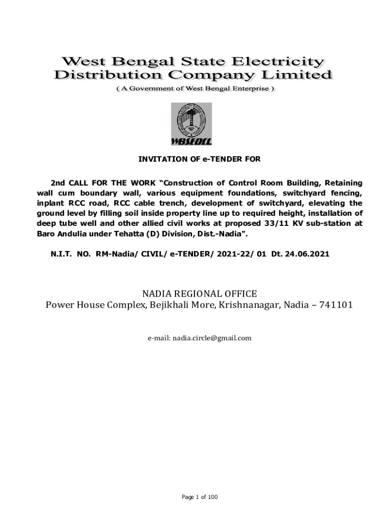 INVITATION OF tender FOR 2nd CALL FOR THE WORK Construction of Control Room Building, Retaining wall come boundary wall, various equipment foundations, switchyard fencing, implant RCC road, RCC cable