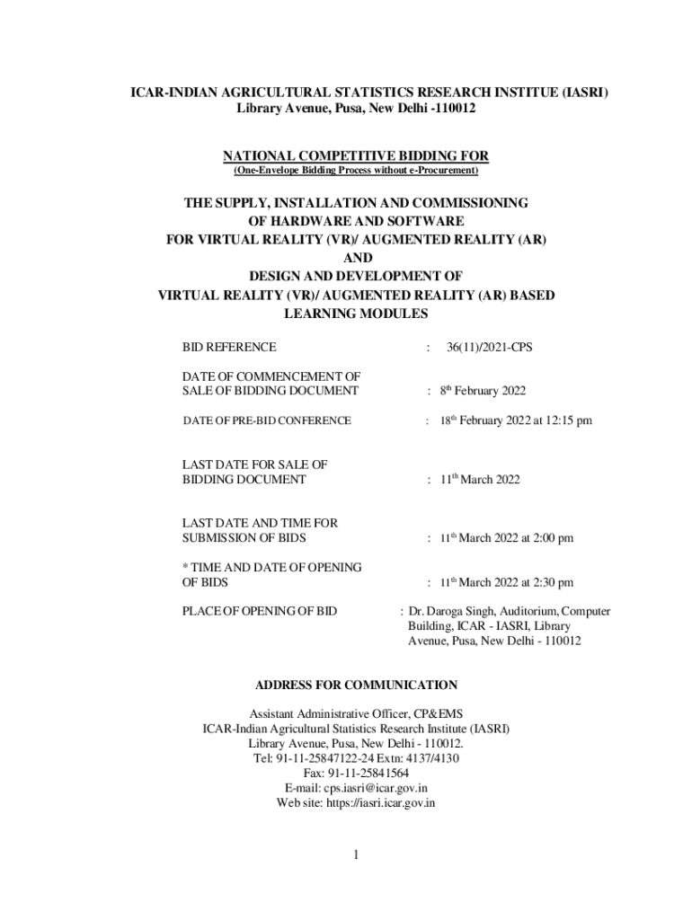 AMERINDIAN AGRICULTURAL STATISTICS RESEARCH INSTITUTE (IASI) Library Avenue, Pusey, New Delhi 110012NATIONAL COMPETITIVE BIDDING FOR (Envelope Bidding Process without procurement)THE SUPPLY, INSTALLATION