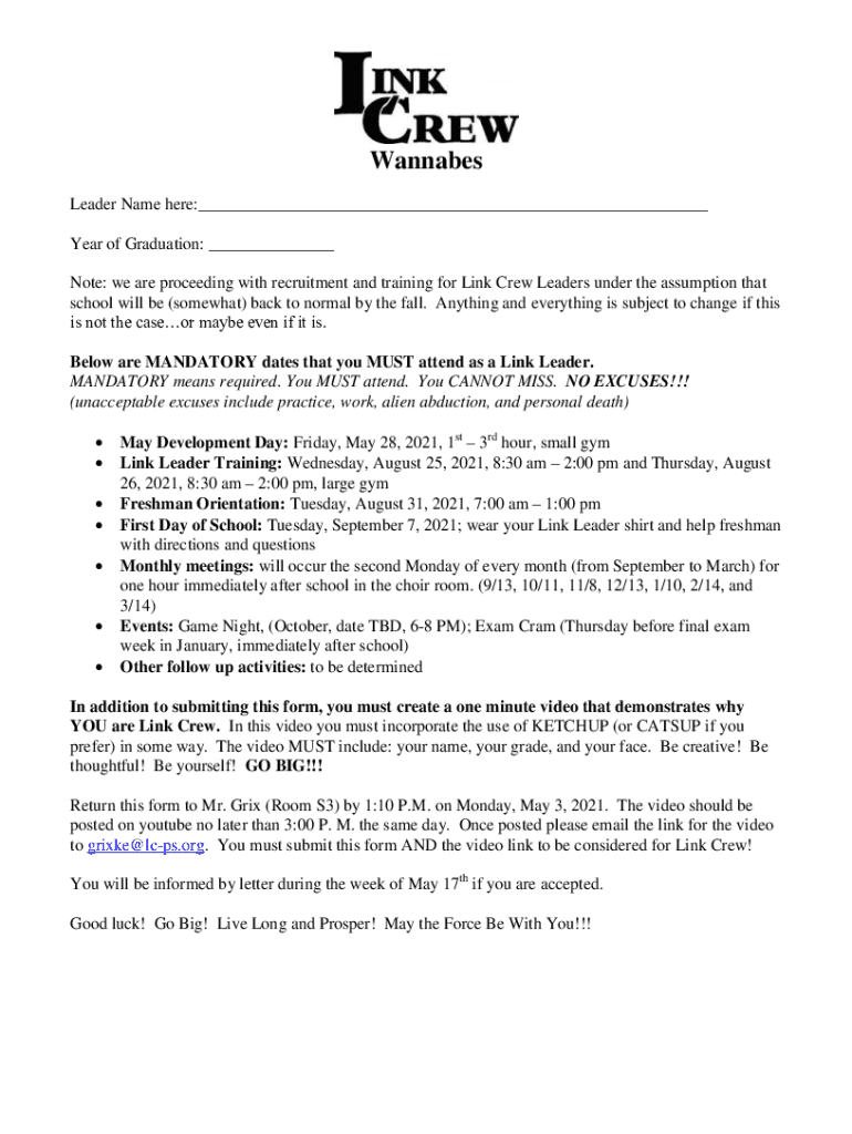 Wannabes Leader Name here:___ Year of Graduation: ___ Note: we are proceeding with recruitment and training for Link Crew Leaders under the assumption that school will be (somewhat) back to normal