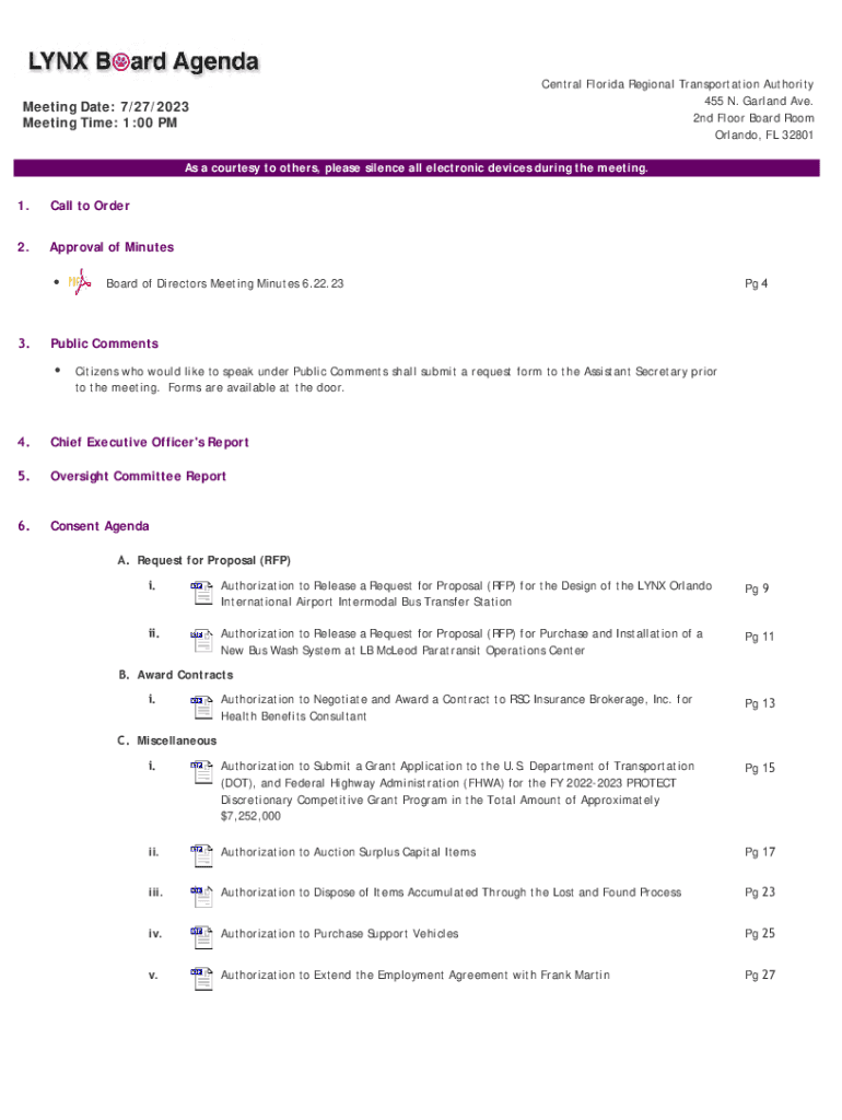Central Florida Regional Transportation Authority 455 N. Garland Ave. 2nd Floor Board Room Orlando, FL 32801Meeting Date: 7/27/2023 Meeting Time: 1:00 PMA's a courtesy to others, please silence all