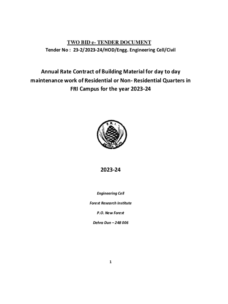 TWO BID e TENDER DOCUMENT Tender No : 232/202324/HOD/Egg. Engineering Cell/CivilAnnual Rate Contract of Building Material for day to day maintenance work of Residential or Non-Residential Quarters