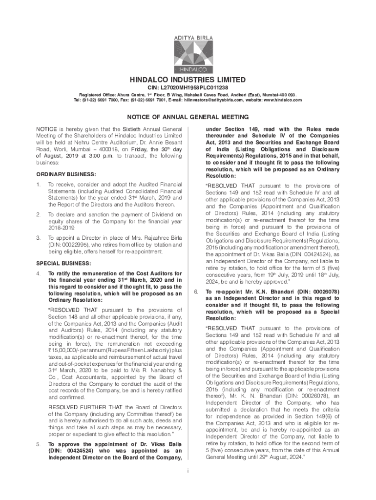 HIDALGO INDUSTRIES LIMITED IN: L27020MH1958PLC011238 Registered Office: Ahura Center, 1st Floor, B Wing, Maharani Caves Road, Adhere (East), Mumbai400 093. Tel: (9122) 6691 7000, Fax: (9122) 6691