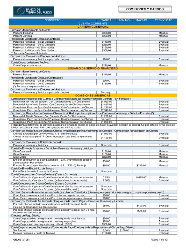 Identificar los diferentes tipos de comisiones y cargos que se aplican a cada transacción o servicio.