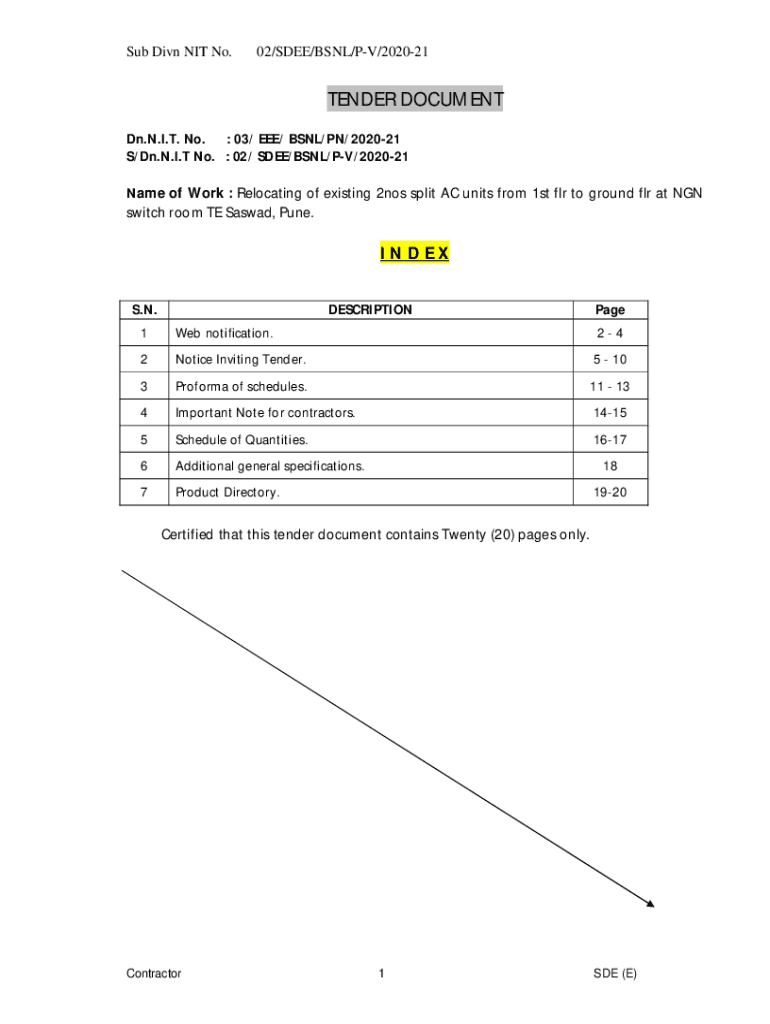 Sub Dive NIT No.02/SDEE/BSNL/PV/202021TENDER DOCUMENT DN. N.I.T. No. 03/ EEE/ BSNL/IN/202021 S/DN. N.I.T No. 02/ SEE/BSNL/PV/202021 Name of Work : Relocating of existing 2nos split AC units from