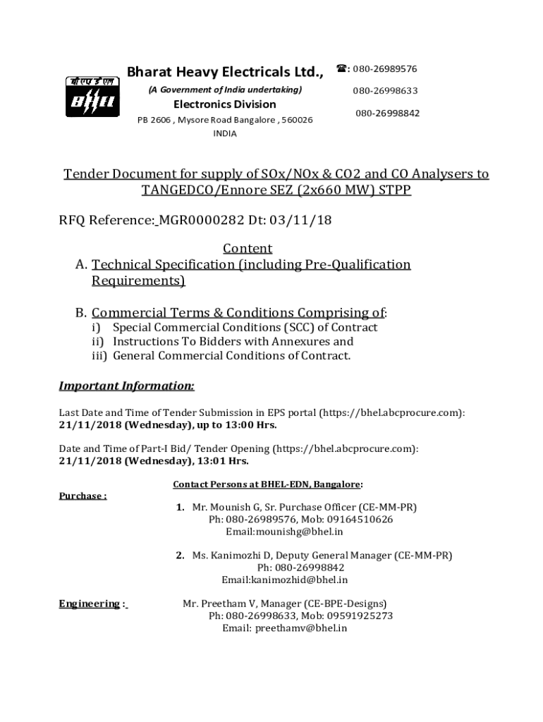 Bharat Heavy Electrical Ltd., (A Government of India undertaking)Electronics Division PB 2606, Mysore Road Bangalore, 560026 INDIA: 08026989576 08026998633 08026998842Tender Document for supply of