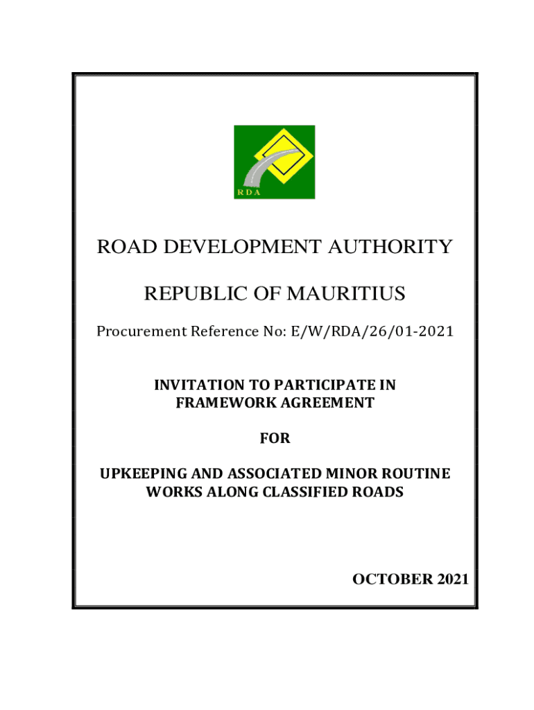 ROAD DEVELOPMENT AUTHORITY REPUBLIC OF MAURITIUS Procurement Reference No: E/W/RDA/26/012021 INVITATION TO PARTICIPATE IN FRAMEWORK AGREEMENT FOR UPKEEP ING AND ASSOCIATED MINOR ROUTINE WORKS ALONG