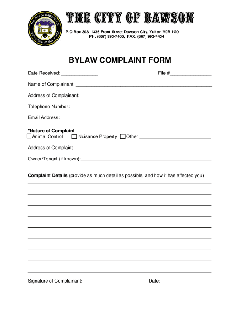 P. O Box 308, 1336 Front Street Dawson City, Yukon Y0B 1G0 PH: (867) 9937400, FAX: (867) 9937434BYLAW COMPLAINT FORM Date Received: ___File #___Name of Complainant: ___ Address of Complainant: ___